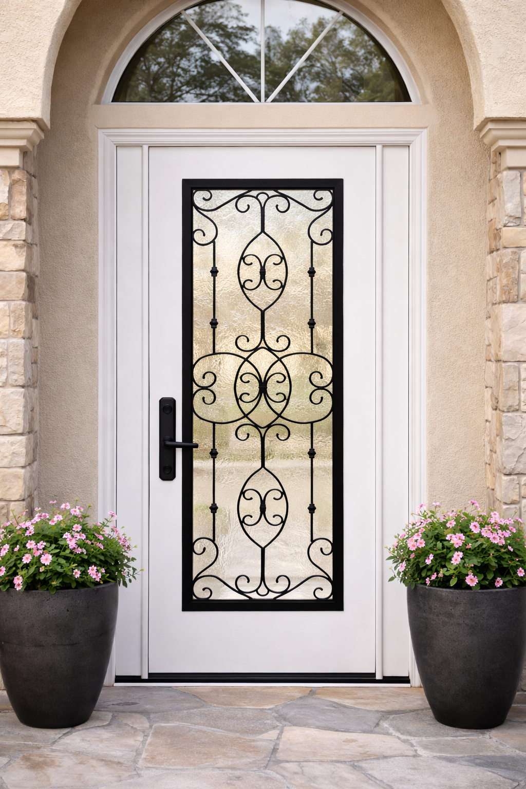 1. Decorative Steel Security Door — Frosted Glass + Wrought-Iron Detailing